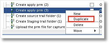 With the options created, we can now add the additional task to the JKM that will create the source to foundation table mappings in the GoldenGate replicat parameter file. The quickest way to add the task is to duplicate a current task. Open the JKM to the Tasks tab and scroll down to the "Create apply prm (3)" step. Right click the task and select Duplicate. A copy of the task will be created and in the order that we want, just after the step we duplicated.