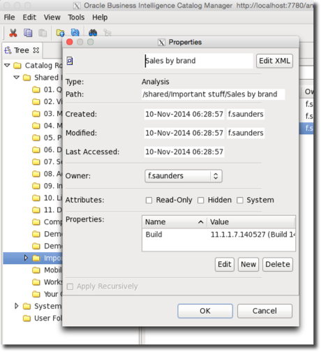 The Presentation Catalog (or “Web Catalog” as it was called in 10g) records who created an object and when it was last modified, accessible through both OBIEE’s Catalog view, and the dedicated Catalog Manager tool itself: