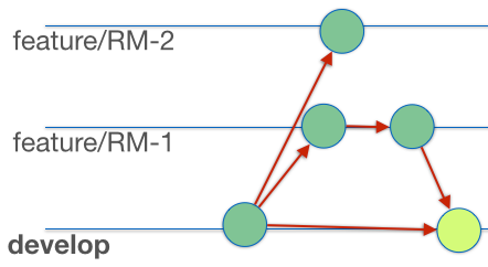 In this simple example we have two concurrent developments - coded “RM–1” and “RM–2”. First off, we create two branches which take the code from our “mainline”. Development is done on the two separate features in each branch independently, and committed frequently per good source control practice. The circles represent commit points:
