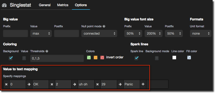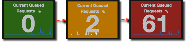 Now for the bit I think is particularly nice - conditional formatting of the singlestat panel. It’s dead easy and not a new concept but is really great way to let a user see at a real glance if there’s something that needs their attention. In the case of this example here, queueing connections, any queueing is dodgy and more than a few is bad (m’kay). So let’s colour code it: