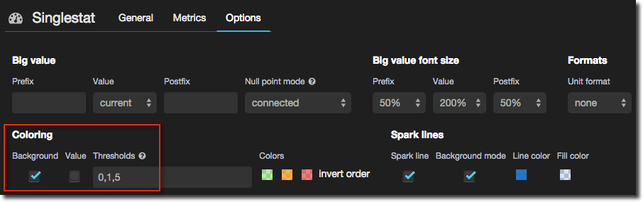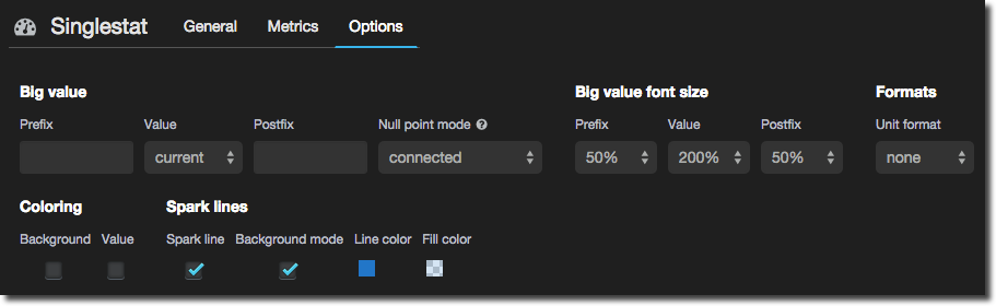 Tick the Spark line box to draw a sparkline within the panel - if you’re not seen them before sparklines are great visualisations for showing the trend of a metric without fussing with axes and specific values. Tick the Background mode to use the entire height of the panel for the graph and overlay the summary figure on top.