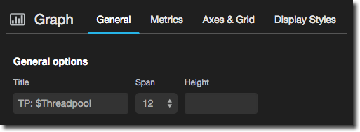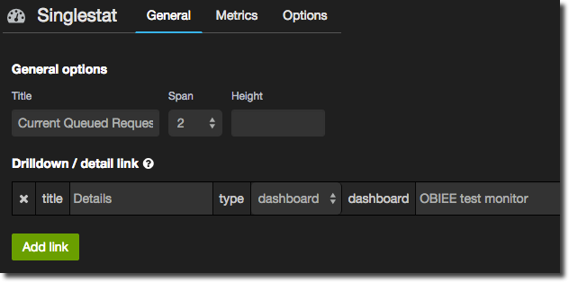 In the General tab set a title for the panel, as well as the width of it – unlike graphs you typically want these panels to be fairly narrow since the point is to show a figure not lots of detail. You’ll notice that I’ve also defined a Drilldown / detail link so that a user can click on the summary figure and go to another dashboard to see more detail.