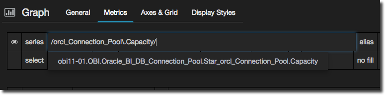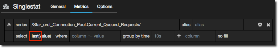 In the Metrics panel specify the series as you would with a graph, but remember you need to pull back just a single series - no point writing a regex to match multiple ones. Here I’m going to show the number of queued requests on a connection pool. Note that because I want to show the latest value I change the aggregation to last: