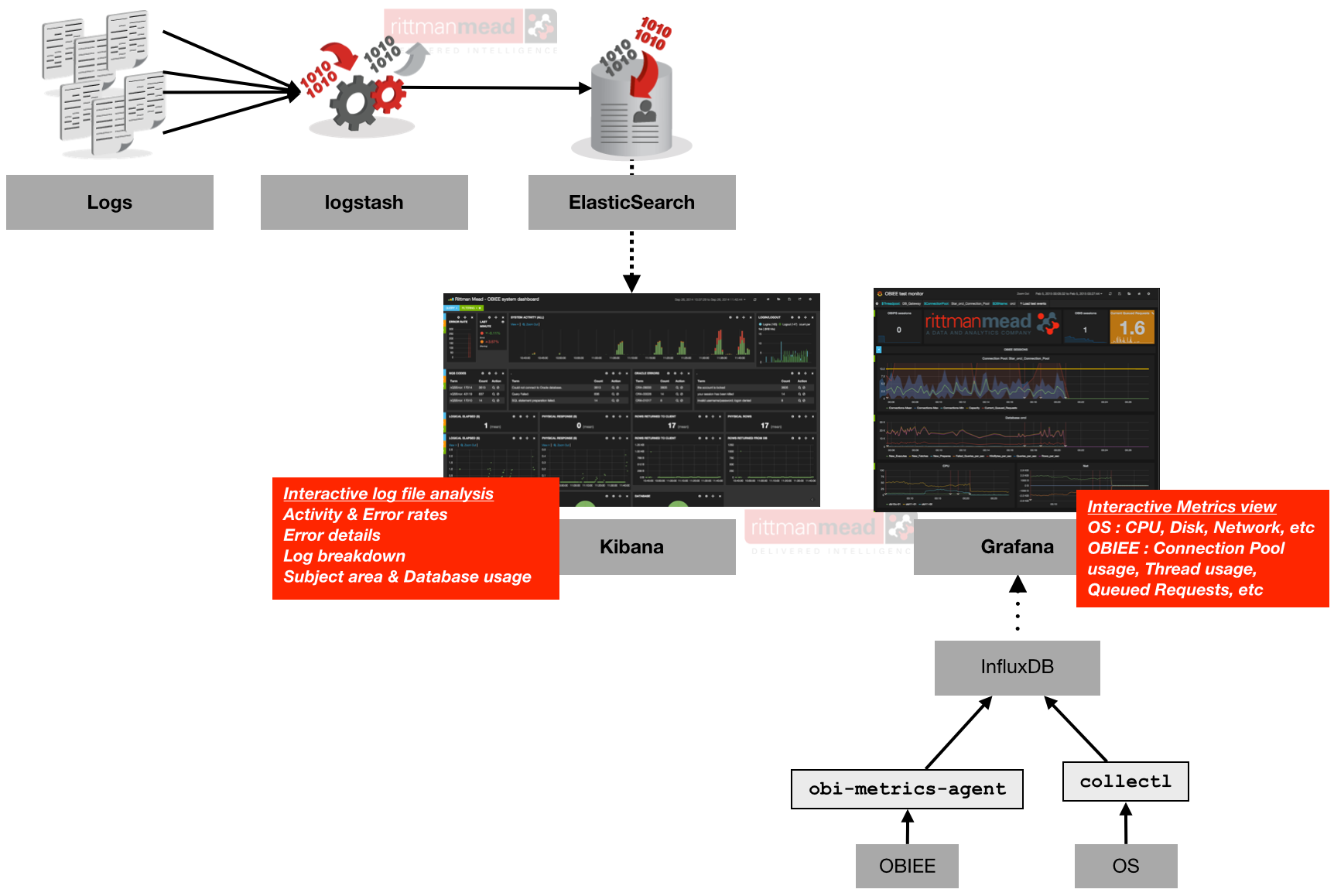 If you’re interested in OBIEE monitoring you might also be interested in the ELK suite of tools that complements what I have described here well, giving an overall setup like this: