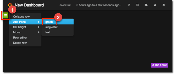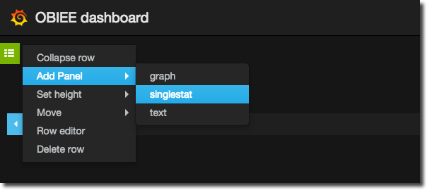 To add one of these to your dashboard go to the green row menu icon on the left (it’s mostly hidden and will pop out when you hover over it) and select Add Panel -> singlestat.