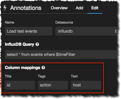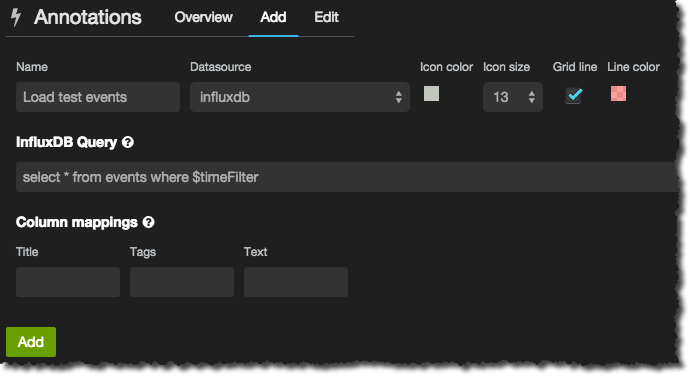 Once enabled use the cog in the top-left corner to open the menu from which you select the Annotations dialog. Click on the Add tab. Give the event group a name, and then the InfluxDB query that pulls back the relevant data. All you need to do is take the above query that you used to test out the data and append the necessary time predicate where $timeFilter so that only events for the time window currently being shown are returned: