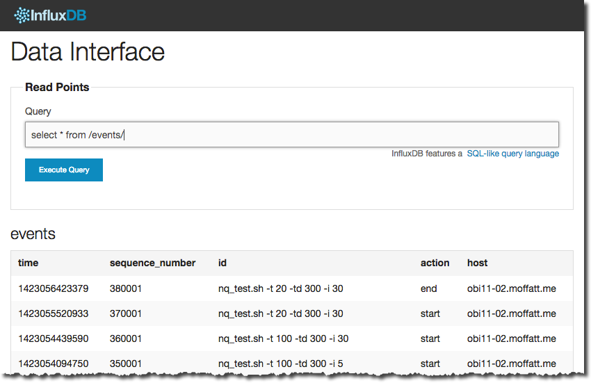 Once we’ve got a series (“table”) in InfluxDB with our events in, pulling them through into Grafana is pretty simple. Let’s first check the data we’ve got, by going to the InfluxDB web UI (http://influxdb:8083) and from the Explore Data » page running a query against the series we’ve loaded: