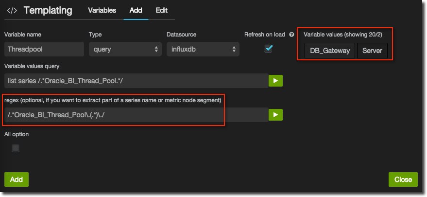 If the values are likely to change (for example, Connection Pool names will change in OBIEE depending on the RPD) then make sure you select Refresh on load. Click Add and you’re done.