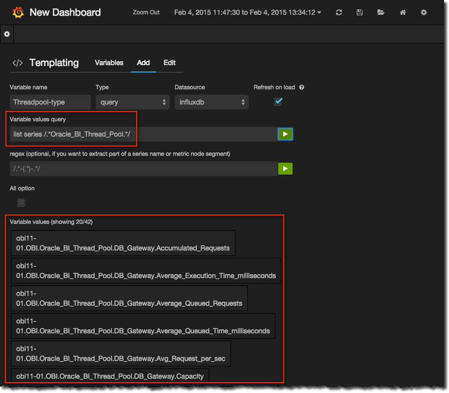 Now set up the name of the variable, and specify a full (not partial, as you would in the graph panel) InfluxDB query that will return all the values for the variable - or rather, the list of all series from which you’re going to take the variable name.