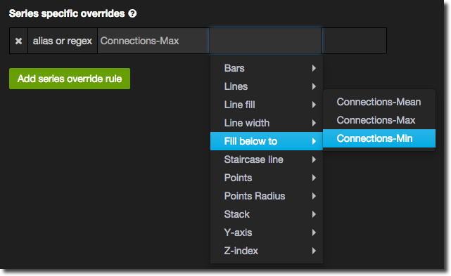 - On the Display Styles tab click Add series override rule at the bottom of the page. In the alias or regex box you should see your aliases listed. Select the one which is the maximum series. Then choose the formatting option Fill below to and select the minimum series