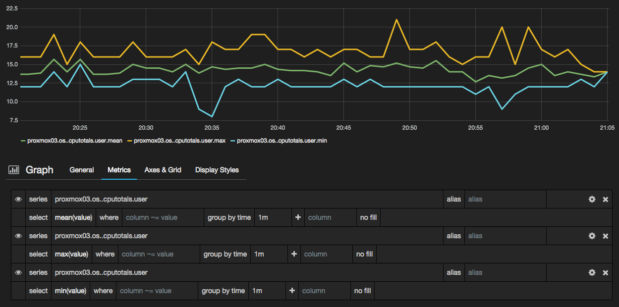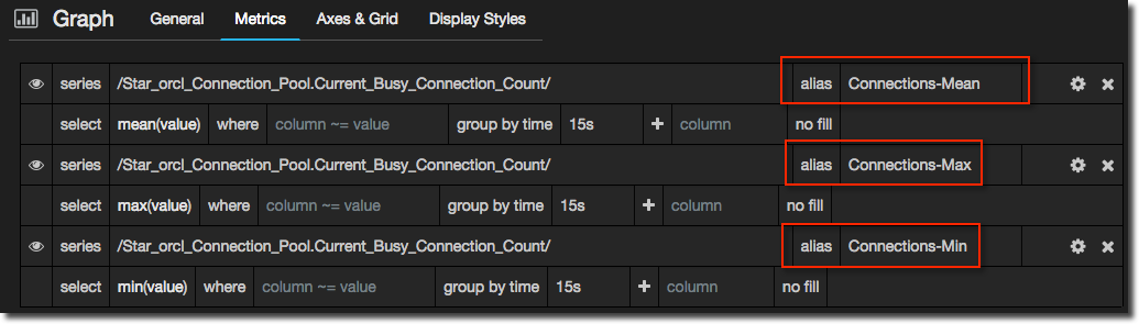 - Make sure that each metric has an alias. This is used in the label but importantly is also used in the next step to identify each data series. You can skip this bit if you really want and regex the series to match directly in the next step, but setting an alias is much easier