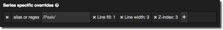 The presentation options that you specify for a graph will by default apply to all series shown in the graph. As we saw previously you can change the colour, width, fill etc of a line, or render the graph as bars and/or points instead. This is all good stuff, but presumes that all measures are created equal - that every piece of data on the graph has the same meaning and importance. Often we’ll want to change how display a particular set of data, and we can use Series Specific Overrides in Grafana to do that.