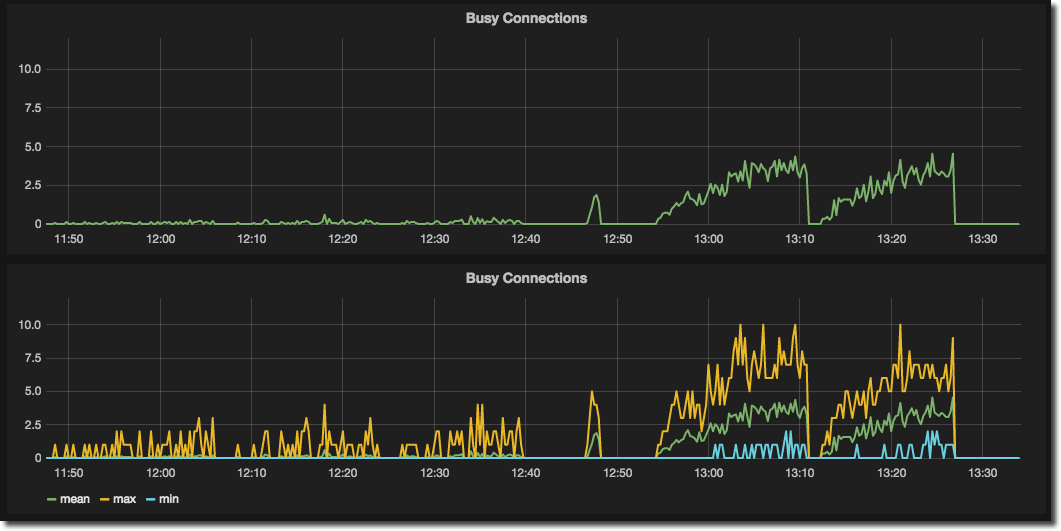 But the actual (Busy Connections) is the piece of data we want to see at a glance, against the context of the available Capacity. So by setting up a Series Specific Override we can change the formatting of each line individually - calling out the actual (thick green) and making the threshold more muted (purple):