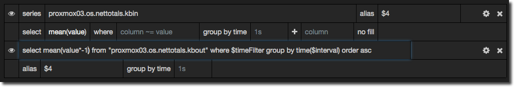 Which certainly for my money is easier to see at a glance whether we’ve got data coming or going, and at what volume. To implement this simply set up your series as usual, and then for the series you want to invert click on the cog icon and select Raw query mode. Then in place of