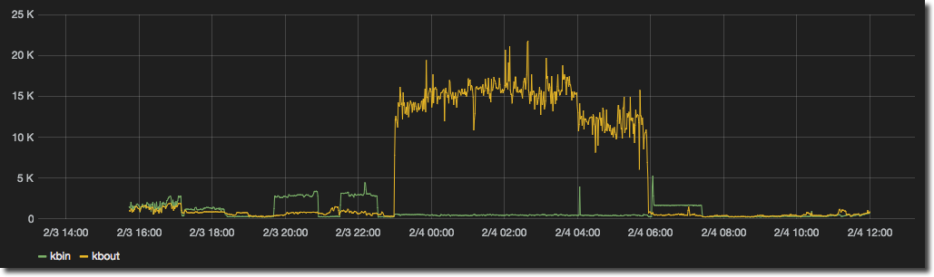 As mentioned just above, you can customise the query sent to InfluxDB, which means you can do this neat trick to render multiple related series that would otherwise overlap by inverting one of them. In this example I’ve got the network I/O drawn conventionally: