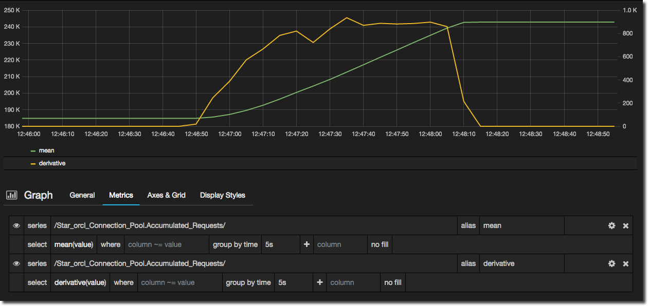 Note that if you are using derivative you may need to fix the group by time to the grain at which you are storing data. In my example I am storing data every 5 seconds, but if the default time grain on the graph is 1s then it won’t show the derivative data.