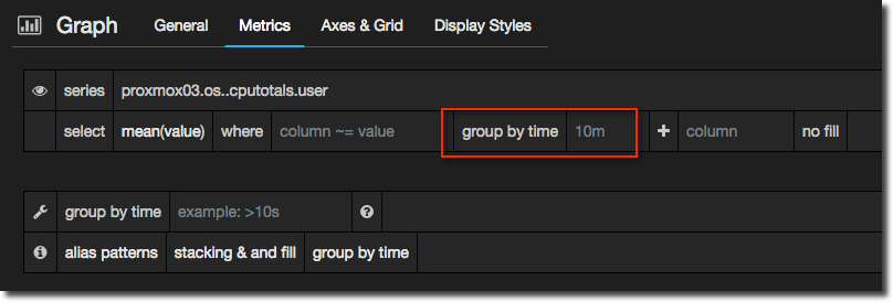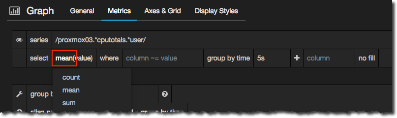 See more details about the aggregations available in InfluxDB in the docs here. If you want to use an aggregation (or any query) that isn’t supported in the Grafana interface simply click on the cog icon and select Raw query mode from where you can customise the query to your heart’s content.
