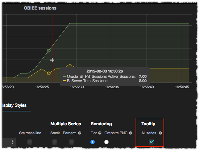 A very useful formatting option is Z-index, which enables you to define the layering on the graph so that a given series is rendered on top (or below) another. To bring something to the very front use a Z-index of 3; for the very back use -3. Series Specific Overrides are also a good way of dynamically assigning multiple Y axes.