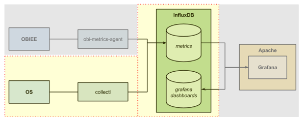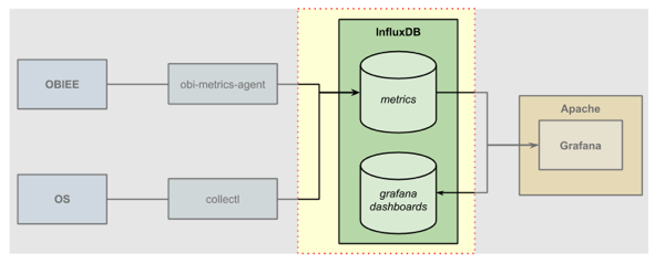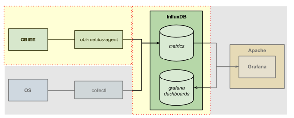 To get the DMS data out of OBIEE we're going to use the obi-metrics-agent tool that Rittman Mead open-sourced last year. This connects to OPMN and pulls the data out. We’ll store the data in InfluxDB, and then visualise it in Grafana. Whilst not mandatory for the DMS stats, we’ll also setup collectl so that we can show OS stats alongside the DMS ones.