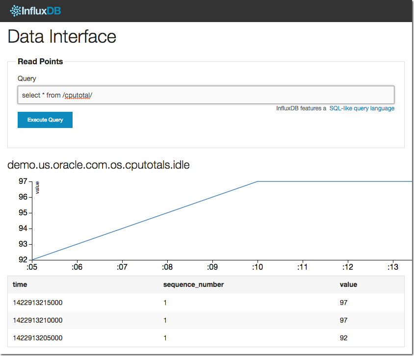 You’ll notice that what we’re doing here (“SELECT … FROM …”) looks pretty SQL-like. Indeed, InfluxDB support a SQL-like query language, which if you’re coming from an RDBMS background is nicely comforting ;-)