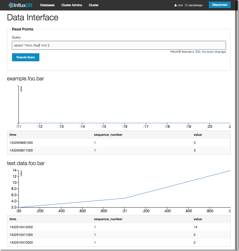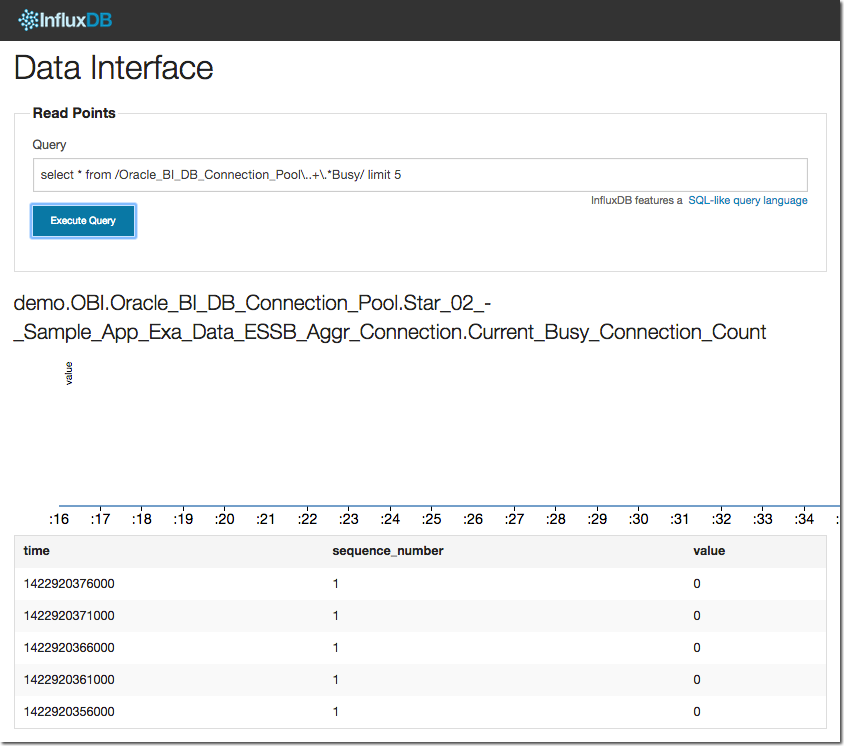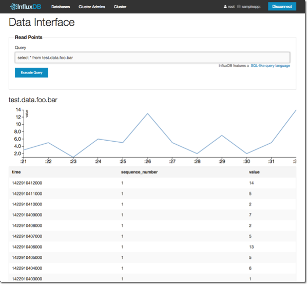 Let’s go back to the InfluxDB web UI and have a look at the new data, using the literal series name in the query: