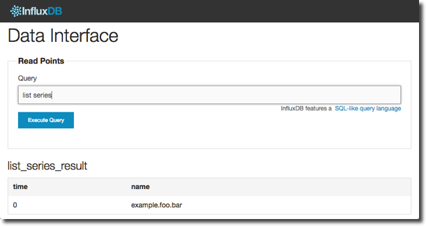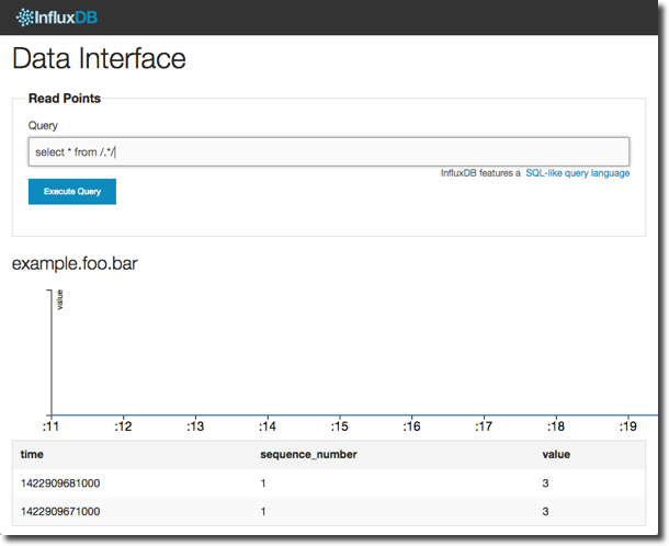 The syntax is documented, but what I would point out is the apparently odd /./ constructor for the “table” is in fact a regular expression (regex) to match the series for which to return values. We could have written select * from example.foo.bar but the . wildcard enclosed in the / / regex delimiters is a quick way to check all the series we’ve got.