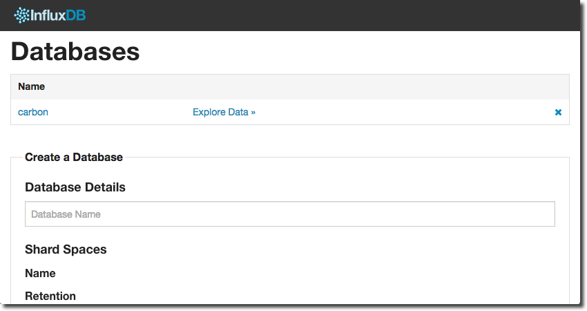 Login as root/root, and you’ll see a list of nothing much, since we’ve not got any databases yet. You can create a database from here, but for repeatability and a general preference for using the command line here is how to create a database called carbon with the HTTP API called from curl (assuming you’re running it locally; change localhost if not):