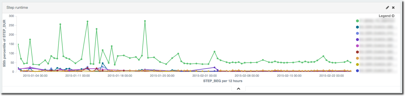 But what was causing the variation? By digging a notch deeper and looking at the runtime of the individual steps within the given session it can be seen that the inconsistent runtime was caused by a single step (the green line in this graph) within the execution. When this step’s runtime stabilises, so does the overall performance of the session: