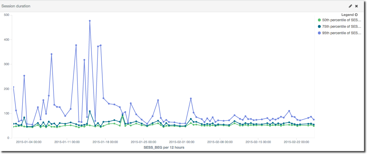Let’s take a bit of a walk through the ODI dashboard that I’ve put together. First up is a view on the number of sessions that have run over time, along with their duration. For duration I’ve shown 50th (median), 75th and 95th percentiles to get an idea of the spread of session runtimes. At the moment we’re looking at all sessions, so it's not surprising that there is a wide range since there’ll always be small sessions and longer ones: