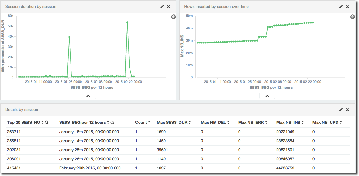 Simply clicking on it then filters the dashboard and now the session details table and graph show information just for that session, including duration, and rows processed: