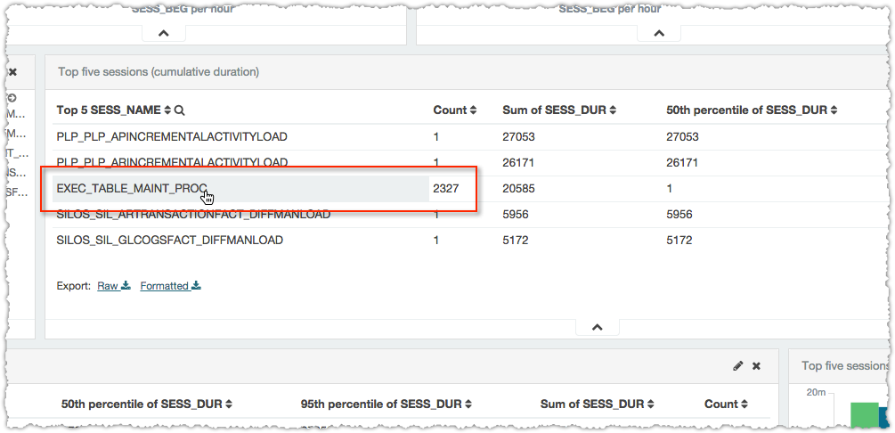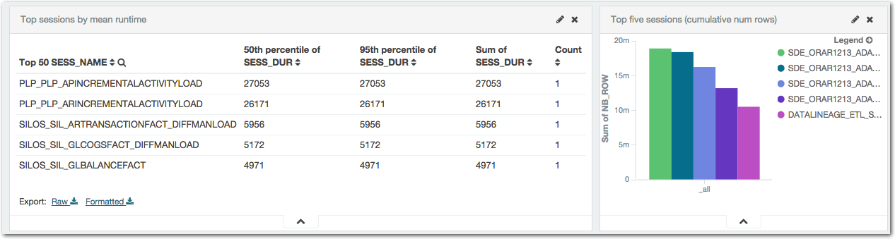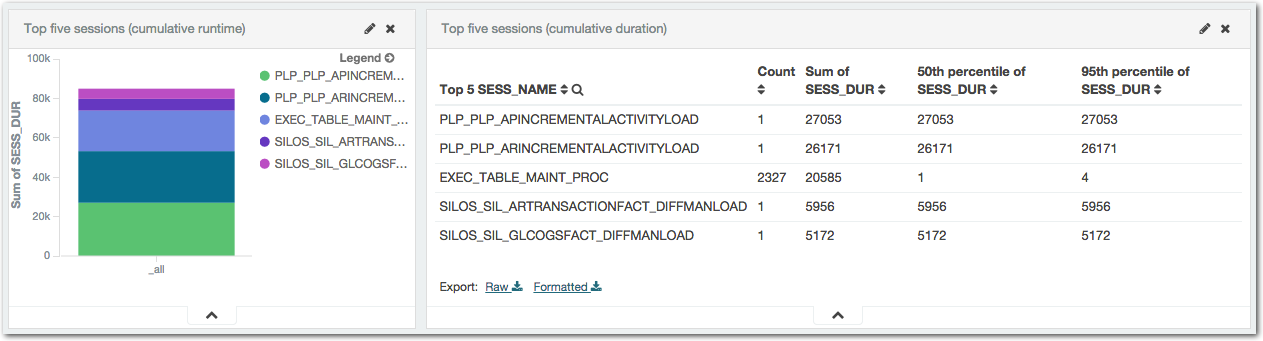 Next up on the dashboard comes a summary of top sessions by runtime, both cumulative and per-session. The longest running sessions are an obvious point of interest, but cumulative runtime is also important; something may only take a short while to run when compared to some singular long-running sessions, but if it runs hundreds of times then it all adds up and can give a big performance boost if time is shaved off it.