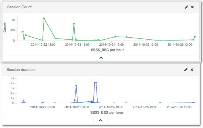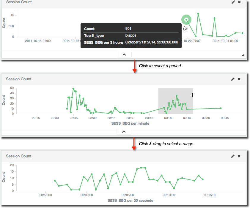 Kibana dashboards are interactive, so you can click on a point in a graph to zoom in on that time period, as well as click & drag to select an arbitrary range. The latter technique is sometimes known as “Brushing”, and if I’m not describing it very well have a look at this example here and you’ll see in an instant what I mean.