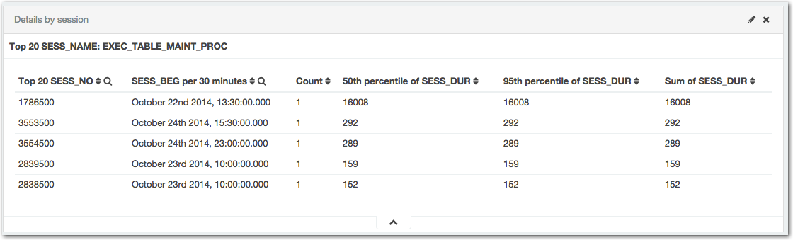 The final element on this first dashboard is one giving the detail for each of the top x long-running session executions, including the session number so that it can be examined in further detail through the Operator tool.