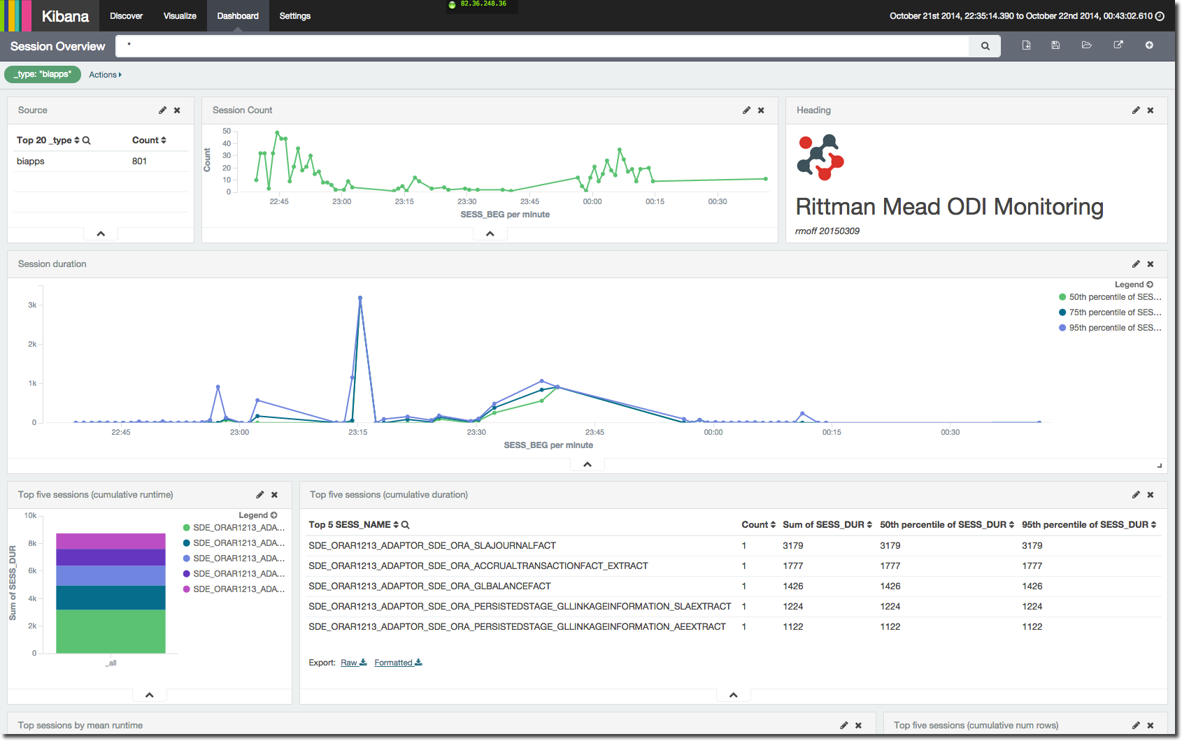 ODI writes runtime information to the database, about sessions run, steps executed, time taken and rows processed. This data is important for analysing things like performance issues, and batch run times. Whilst with the equivalent runtime data (Usage Tracking) from OBIEE there is the superb RPD/Dashboard content that Oracle ship in SampleApp v406, for ODI the options aren’t as vast, ultimately being based on home-brew SQL against the repository tables using the repository schema documentation from Oracle. Building an OBIEE metadata model against the ODI schema is one option, but then requires an OBIEE server on which to run it - or merging into an existing OBIEE deployment - which means that it can become more hassle than it’s worth. It also means a bunch of up-front modelling before you get any kind of visualisations and data out. By copying the data across into Elasticsearch it's easy to quickly build analyses against it, and has the additional benefit of retaining the data as long as you'd like meaning that it's still available for long-term trend analysis once the data's been purged from the ODI repository itself.