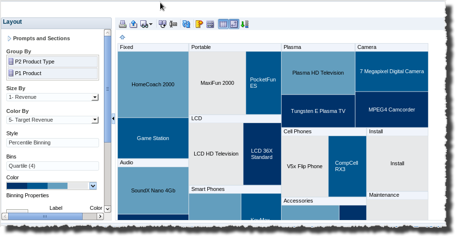 There is a new visualisation called Treemap since OBIEE 11.1.1.7.10. Treemap groups the dimensional data that you selected in the analysis in tiles. By default, the tiles size is based in the content of first measure of the analysis and the tiles colour is based in the content of the second measure. If you have only one measure in your analysis, is used for both size and colour.