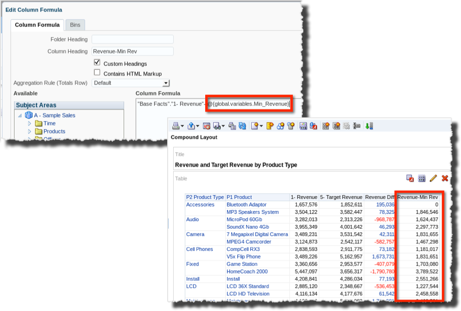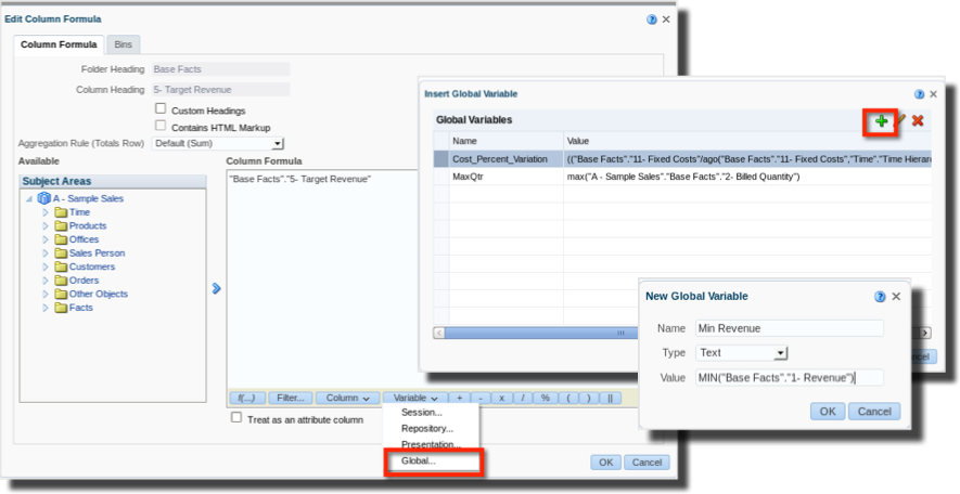 To create a new global variable, select the Edit Formula option for the required column. When you press the Variable button in the Formula Editor you will see the new Global option. The Insert Global Variable dialog appears and you can select an existing global variable to be used in the formula, or you can create a new one. To create a new one you need to enter a name, type and value. If you want to use an expression like in the example (Min(Revenue)) as value, the data type should be Text.