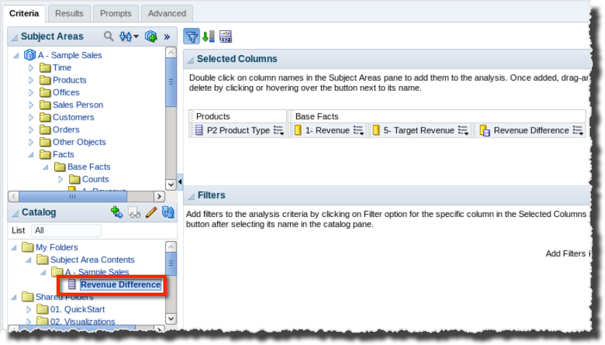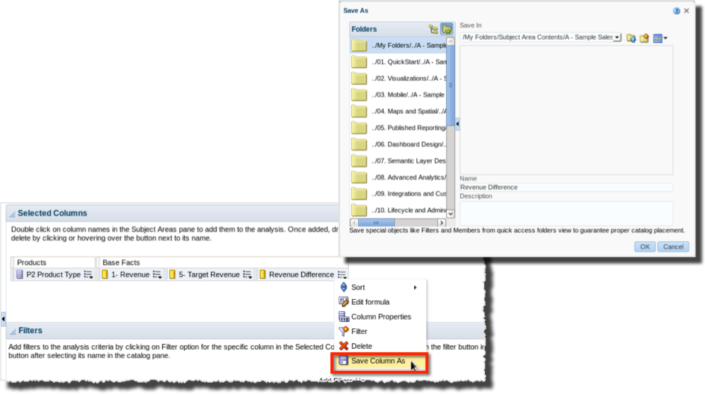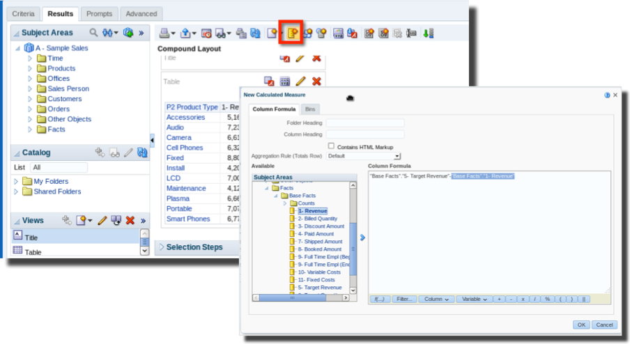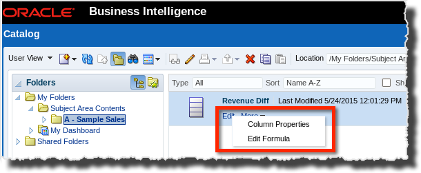 A very useful feature for business users is the possibility to create calculated items in an analysis and save it in the catalog in order to reuse it in other analyses for the same subject area.