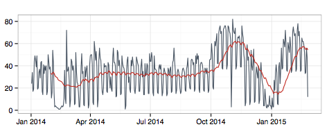 Figure 2 - DAU over time with a trailing 30-day average (Red line)