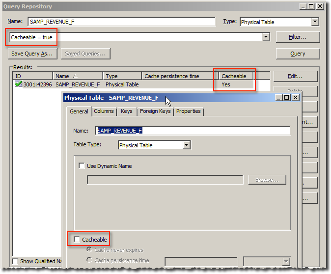 The RPD Query Tool is great for finding objects matching certain criteria. However, it seems to invert results when looking for Cacheable Physical tables - if you add a filter of Cacheable = false you get physical tables where Cacheable is enabled! And the same in reverse (Cacheable = true -> shows Physical tables where Cacheable is disabled)
