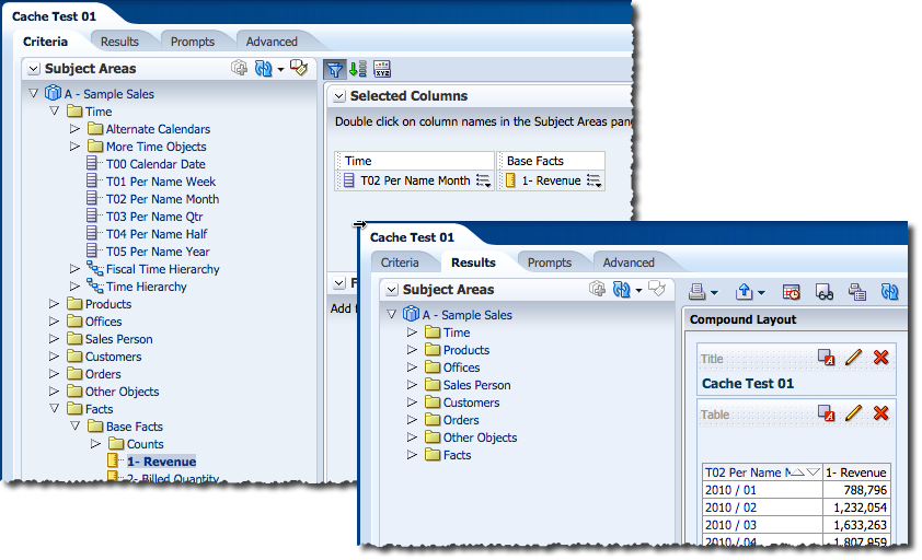 SET VARIABLE SAW_SRC_PATH='/users/weblogic/Cache Test 01', DISABLE_CACHE_HIT=1,DISABLE_CACHE_SEED=1:SELECT 0 s_0, "A - Sample Sales"."Time"."T02 Per Name Month" s_1, "A - Sample Sales"."Base Facts"."1- Revenue" s_2 FROM "A - Sample Sales" ORDER BY 1, 2 ASC NULLS LAST FETCH FIRST 5000001 ROWS ONLY
