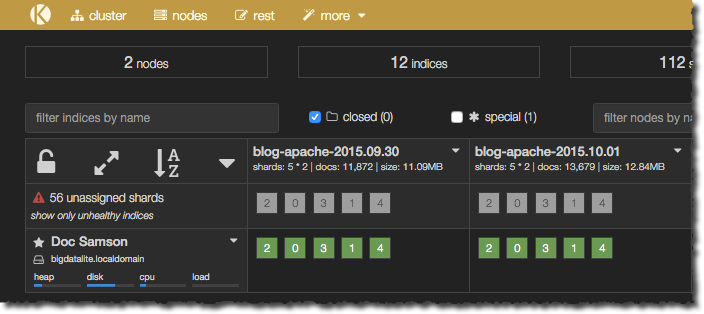 $ curl -s -XGET http://bigdatalite:9200/_cat/indices?v|sort health status index pri rep docs.count docs.deleted store.size pri.store.size yellow open blog-apache-2015.09.30 5 1 11872 0 11mb 11mb yellow open blog-apache-2015.10.01 5 1 13679 0 12.8mb 12.8mb yellow open blog-apache-2015.10.02 5 1 10042 0 9.6mb 9.6mb yellow open blog-apache-2015.10.03 5 1 8722 0 7.3mb 7.3mb