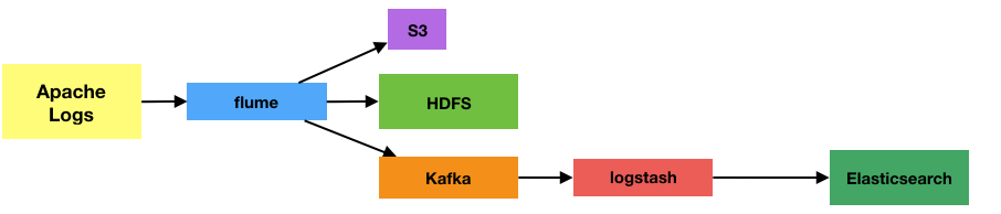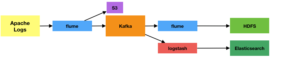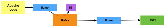 We’re going to evolve the pipeline a bit now. We’ll go back to a single Flume agent writing to HDFS, but add in Amazon’s S3 as the target for the unprocessed log files. The point here is not so much that S3 is the best place to store log files (although it is a good option), but as a way to demonstrate a secondary method of keeping your raw data available without impacting the source system. It also fits nicely with using the Kafka flume channel to tighten the pipeline up a tad: