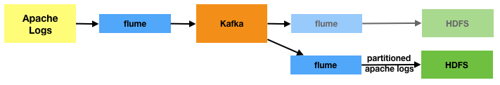 All we’ve done to this point is add Kafka into the pipeline, ready for subsequent use. We’ve not changed the nett output of the data pipeline. But, we can now benefit from having Kafka there, by re-running some of our HDFS load without having to go back to the source files. Let’s say we want to partition the logs as we store them. But, we don’t want to disrupt the existing processing. How? Easy! Just create another Flume agent with the additional configuration in to do the partitioning.