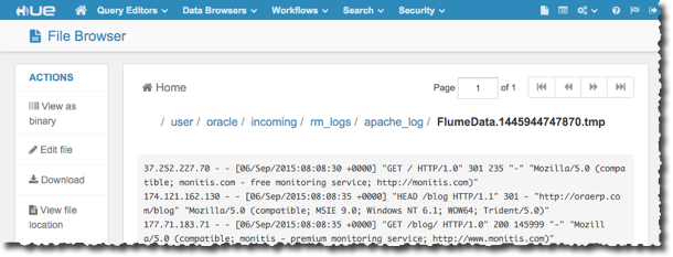 [oracle@bigdatalite ~]$ /opt/kafka_2.10-0.8.2.1/bin/kafka-console-consumer.sh \ --zookeeper bigdatalite:2181 --topic apache_logs 37.252.227.70 - - [06/Sep/2015:08:08:30 +0000] "GET / HTTP/1.0" 301 235 "-" "Mozilla/5.0 (compatible; monitis.com - free monitoring service; http://monitis.com)" 174.121.162.130 - - [06/Sep/2015:08:08:35 +0000] "HEAD /blog HTTP/1.1" 301 - "http://oraerp.com/blog" "Mozilla/5.0 (compatible; MSIE 9.0; Windows NT 6.1; WOW64; Trident/5.0)" 177.71.183.71 - - [06/Sep/2015:08:08:35 +0000] "GET /blog/ HTTP/1.0" 200 145999 "-" "Mozilla/5.0 (compatible; monitis - premium monitoring service; http://www.monitis.com)" 174.121.162.130 - - [06/Sep/2015:08:08:36 +0000] "HEAD /blog/ HTTP/1.1" 200 - "http://oraerp.com/blog" "Mozilla/5.0 (compatible; MSIE 9.0; Windows NT 6.1; WOW64; Trident/5.0)" 173.192.34.91 - - [06/Sep/2015:08:08:44 +0000] "GET / HTTP/1.0" 301 235 "-" "Mozilla/5.0 (compatible; monitis.com - free monitoring service; http://monitis.com)" 217.146.9.53 - - [06/Sep/2015:08:08:58 +0000] "GET / HTTP/1.0" 301 235 "-" "Mozilla/5.0 (compatible; monitis - premium monitoring service; http://www.monitis.com)" 82.47.31.235 - - [06/Sep/2015:08:08:58 +0000] "GET / HTTP/1.1" 200 36946 "-" "Echoping/6.0.2"