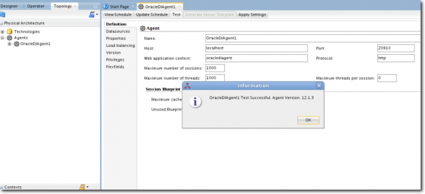 Once these commands have executed successfully you’ll want to confirm the agent is running without issue by clicking on the “Test” button by opening the agent you created in the Physical Architecture in ODI Studio.