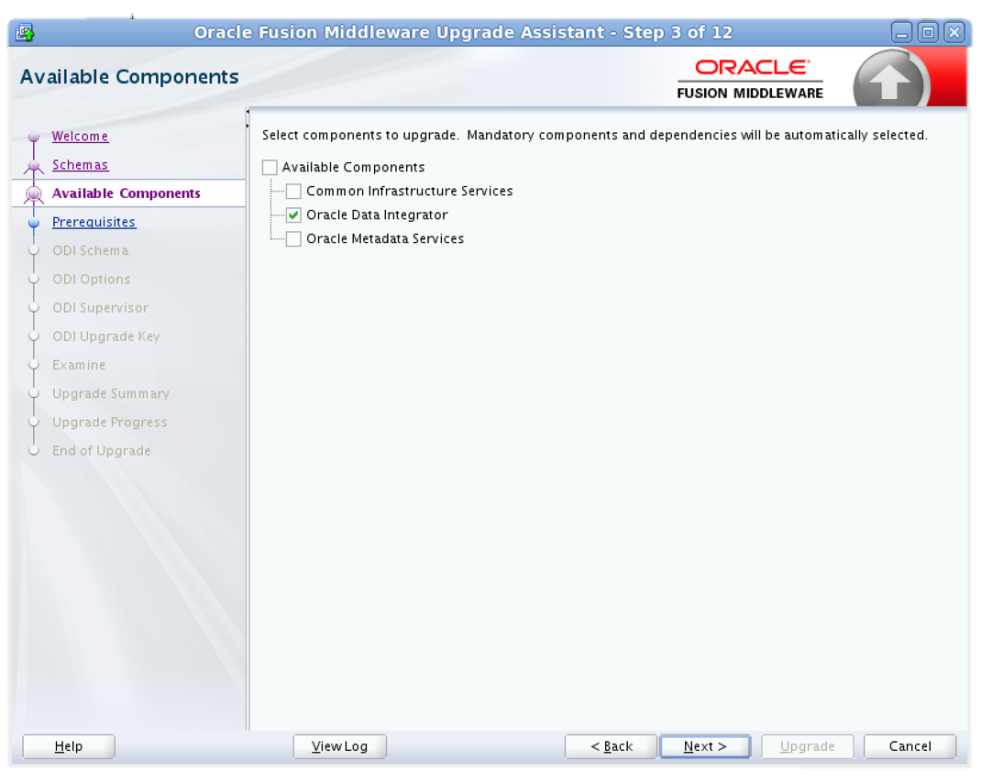 The upgrade assistant will then list the schemas available to upgrade. When asked what components to upgrade, you will select “Oracle Data Integrator”.