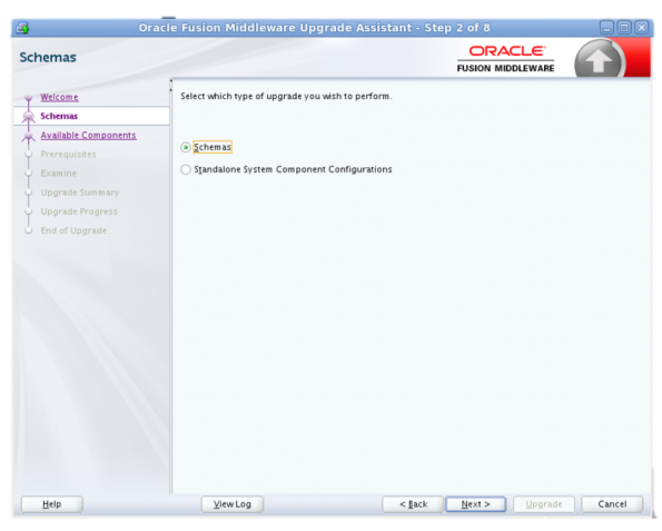 When asked what type of upgrade you wish to perform, you will want to select “Schemas” as this will allow you to identify the schemas where the upgrade will take place.