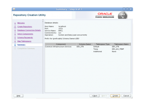 As you enter the schema passwords and mapping information, the utility will ultimately reach the summary screen where it will show you the new schemas it will create. If any schemas have already been created, be aware that they will not be listed here since they do not need to be created again. At this screen, you click create, and the creation of the new schemas/components will commence.