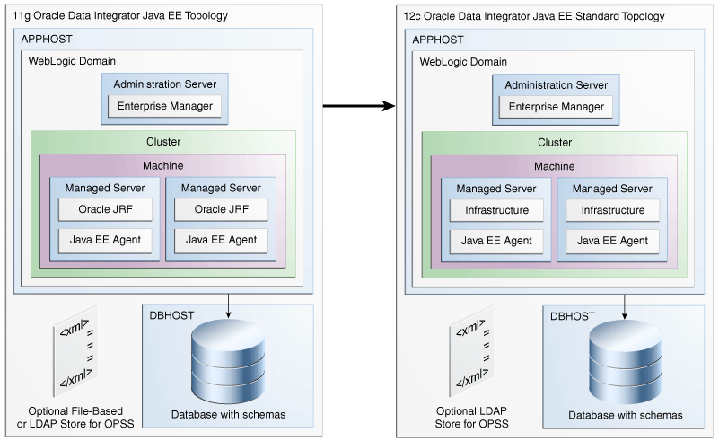Below is a comparison of the ODI JEE Agent Upgrade topology. Notice that in 12c only an LDAP-based store can be used for OPSS as file-based stores are no longer allowed.