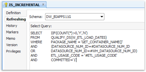 This variable’s refresh logic, shown in the below screenshot, will determine if this package previously completed successfully. After every successful completion an entry gets made into W_ETL_LOAD_DATES with the package name and date timestamp, amongst other audit information.